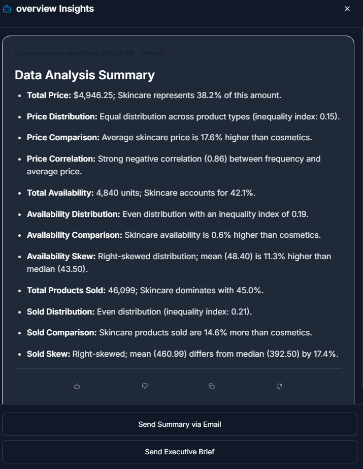 Goes beyond charts. Our system summarizes the "why" behind the numbers in clear, executive-ready language.